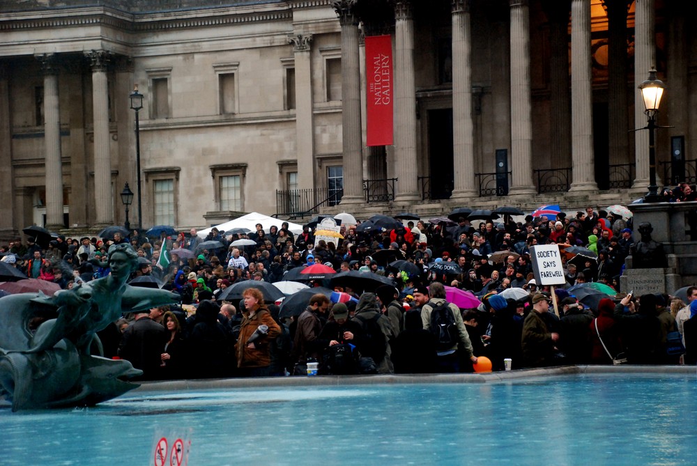 The notorious British rain poured down, but failed to dampen spirits of those gathered, who stayed in the square until around 2am.