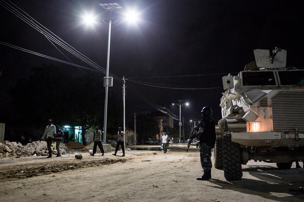 Mogadishu, Somalia – In 2011 African Union Mission in Somalia (AMISOM) forces largely pushed out the armed group al-Shabab from Somalia’s capital city of Mogadishu. Since then, police units from Nigeria and Uganda have been attempting to train and equip the fledgling Somali Police Force (SPF) in securing the capital city. Part of this effort has been conducting nightly joint patrols with the SPF. These patrols, and the recent introduction of solar powered lights onto the city’s main streets, have helped allow businesses to reopen, enabling civilians to move more freely after dark.