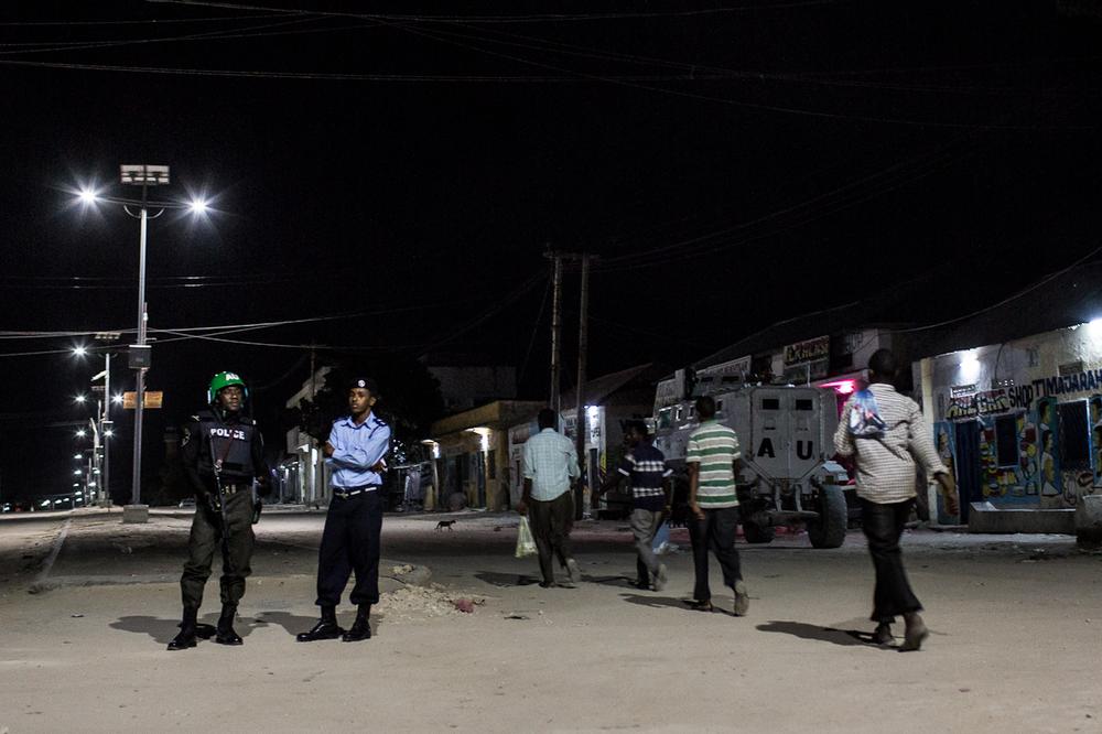 On this evening the AMISOM police were optimistic about the impact night patrols were having in Mogadishu. Illuminated by the solar lights, women fetched water, men chattered outside their shopfronts and boys played football in the dusty streets, activities previously unseen after dark just nine months ago.