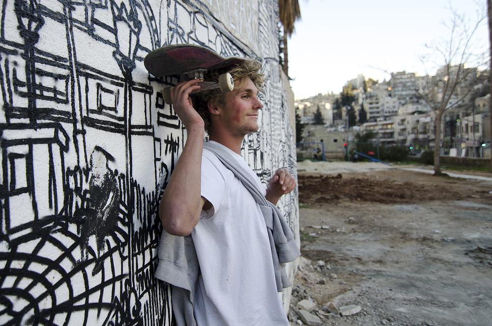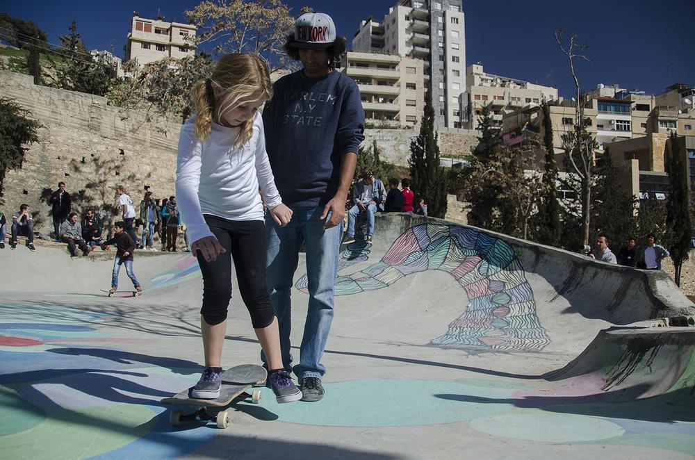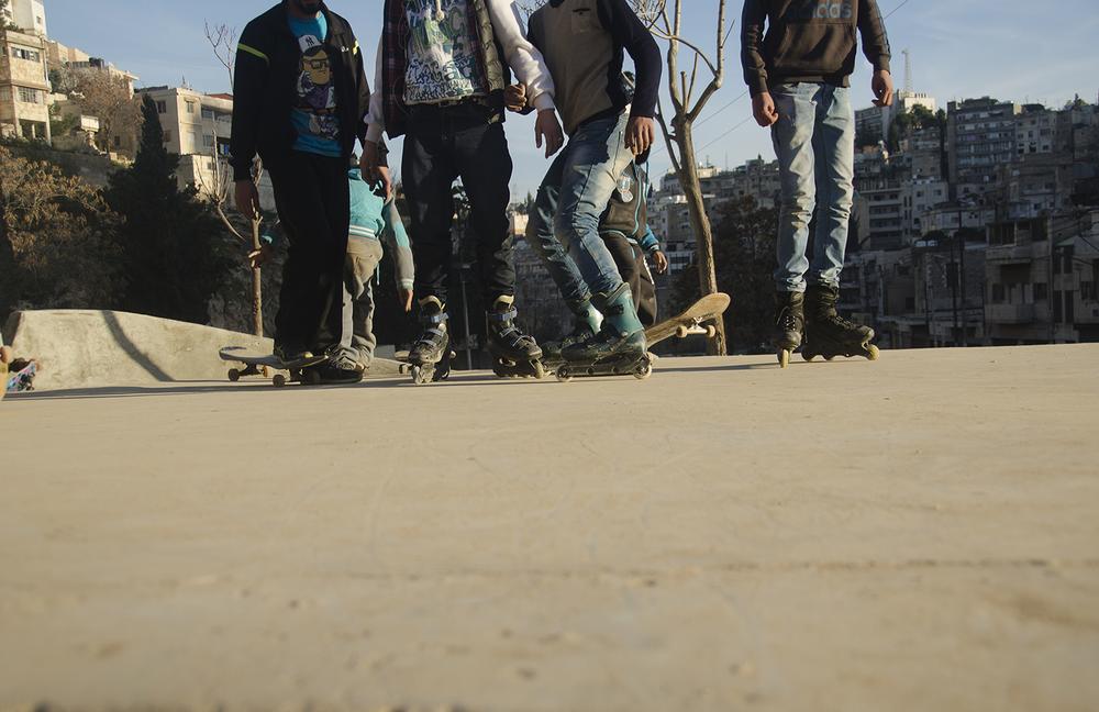 Amman, Jordan– On a warm afternoon in downtown Amman, a Syrian refugee is cheered on via loudspeaker as he weaves his skateboard through a makeshift course of rain boots and traffic cones during a competition at the newly opened 7Hills skate park.