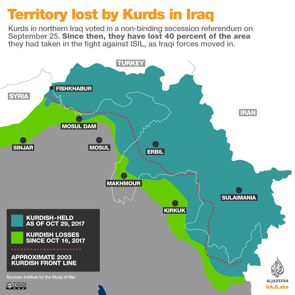 The Kurds found themselves without about 40 percent of the territory they previously held as they withdrew from areas being disputed with Baghdad.