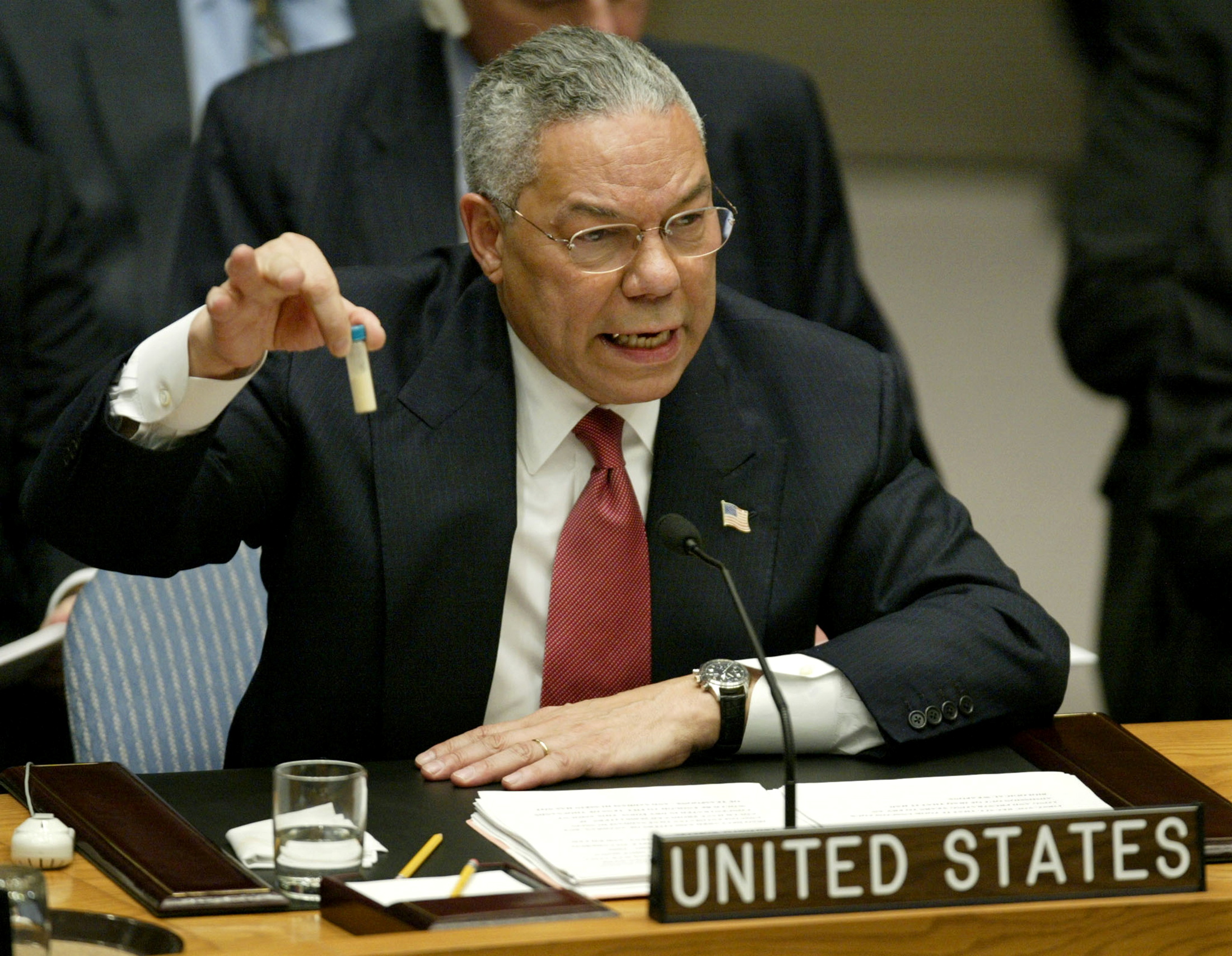 In the Security Council chamber, he displayed photographs and diagrams purporting to detail Iraqi weapons of mass destruction, as well as translations from US intelligence intercepts. At one point, Powell brandished a small vial containing a teaspoon of simulated anthrax, warning that Iraq had not accounted for “tens upon tens upon tens of thousands of teaspoons” of the deadly pathogen.