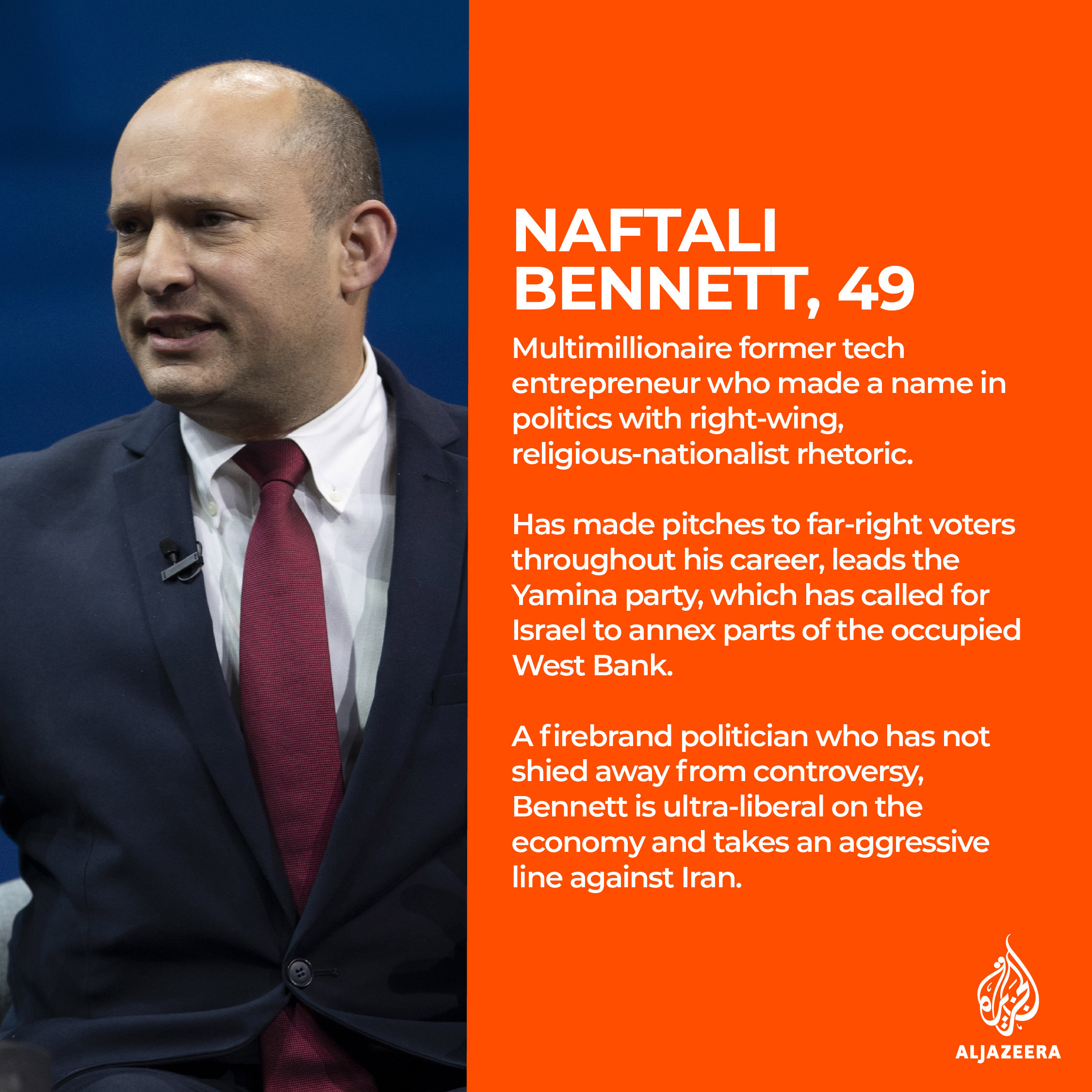 A staunch supporter of Jewish settlements and of the annexation of most of the West Bank, including occupied East Jerusalem, Bennett also opposes a two-state solution to the conflict.