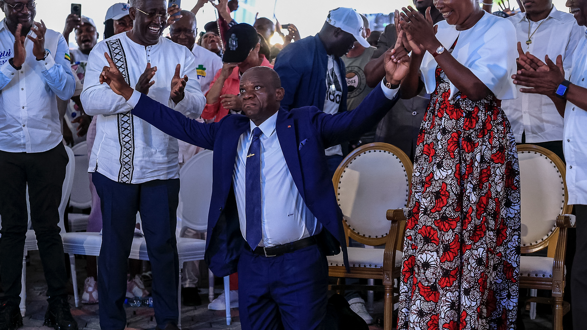 The leader of a 2023 coup, Brice Oligui Nguema, wins in a landslide victory in Gabon.